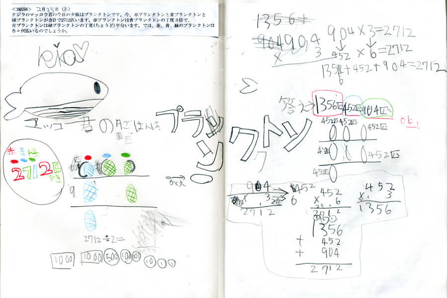 小3向け<3MX056> クジラのマッコウ君の夕飯はプランクトンです。今、赤プランクトンと青プランクトンと緑プランクトンが合計2712匹います。赤プランクトンは青プランクトンの丁度3倍で、青プランクトンは緑プランクトンの丁度半分います。では、赤、青、緑のプランクトンは各々何匹いるのでしょうか。